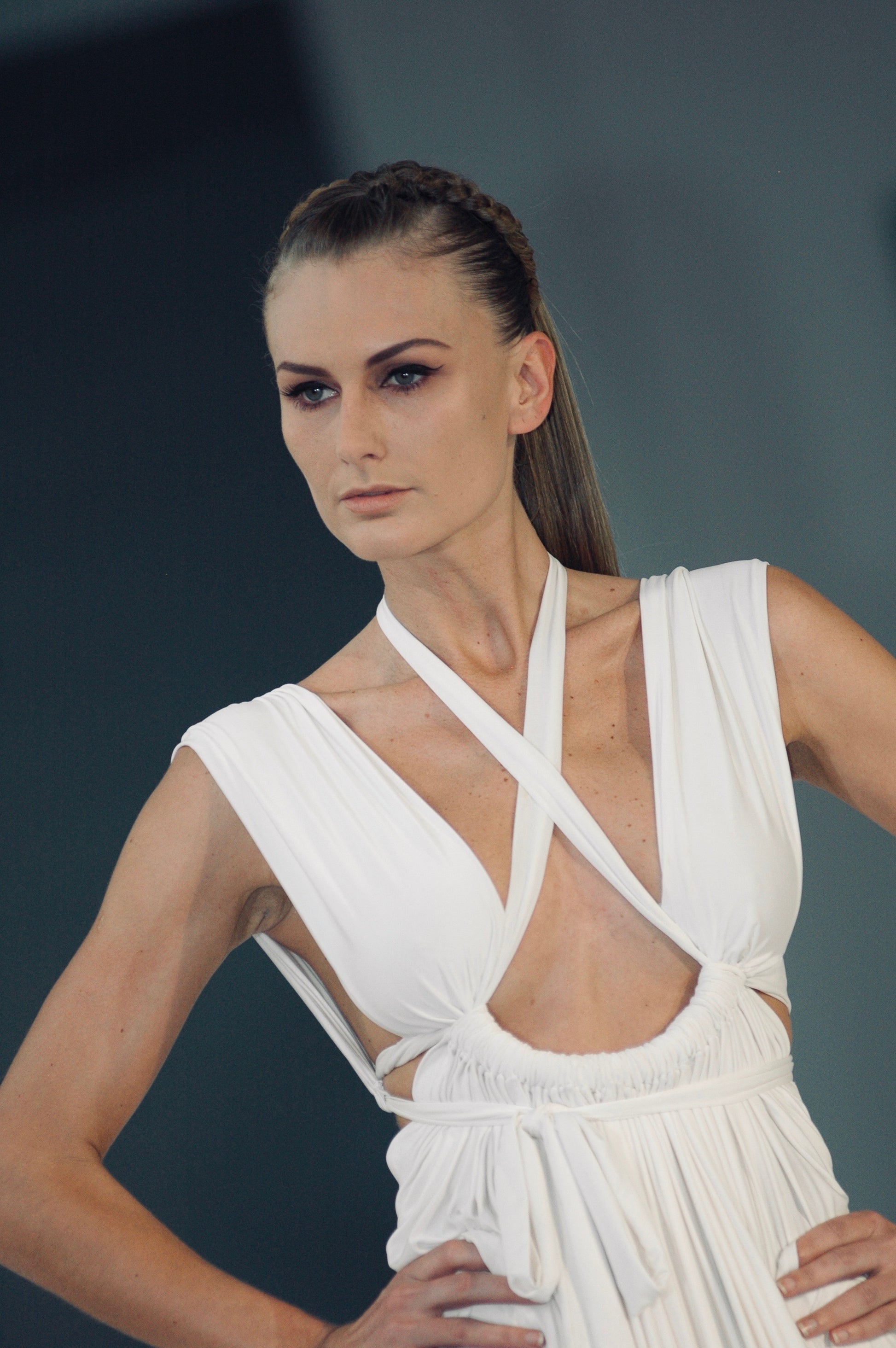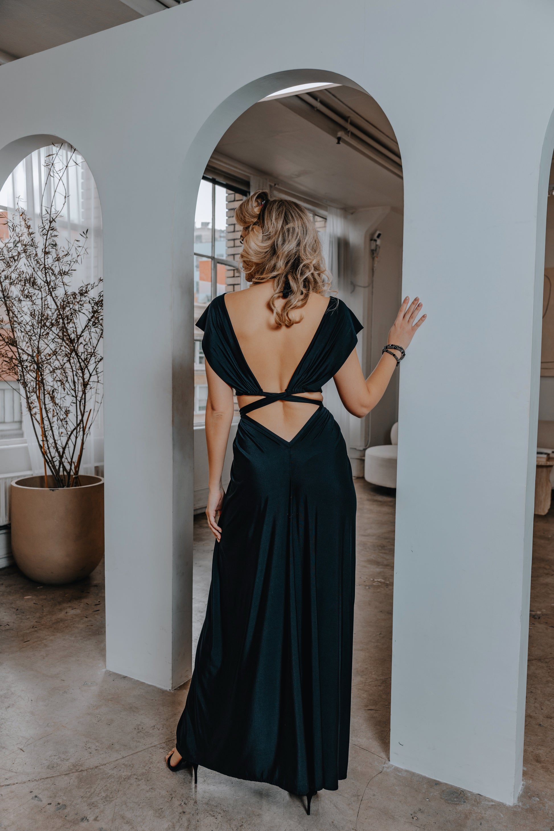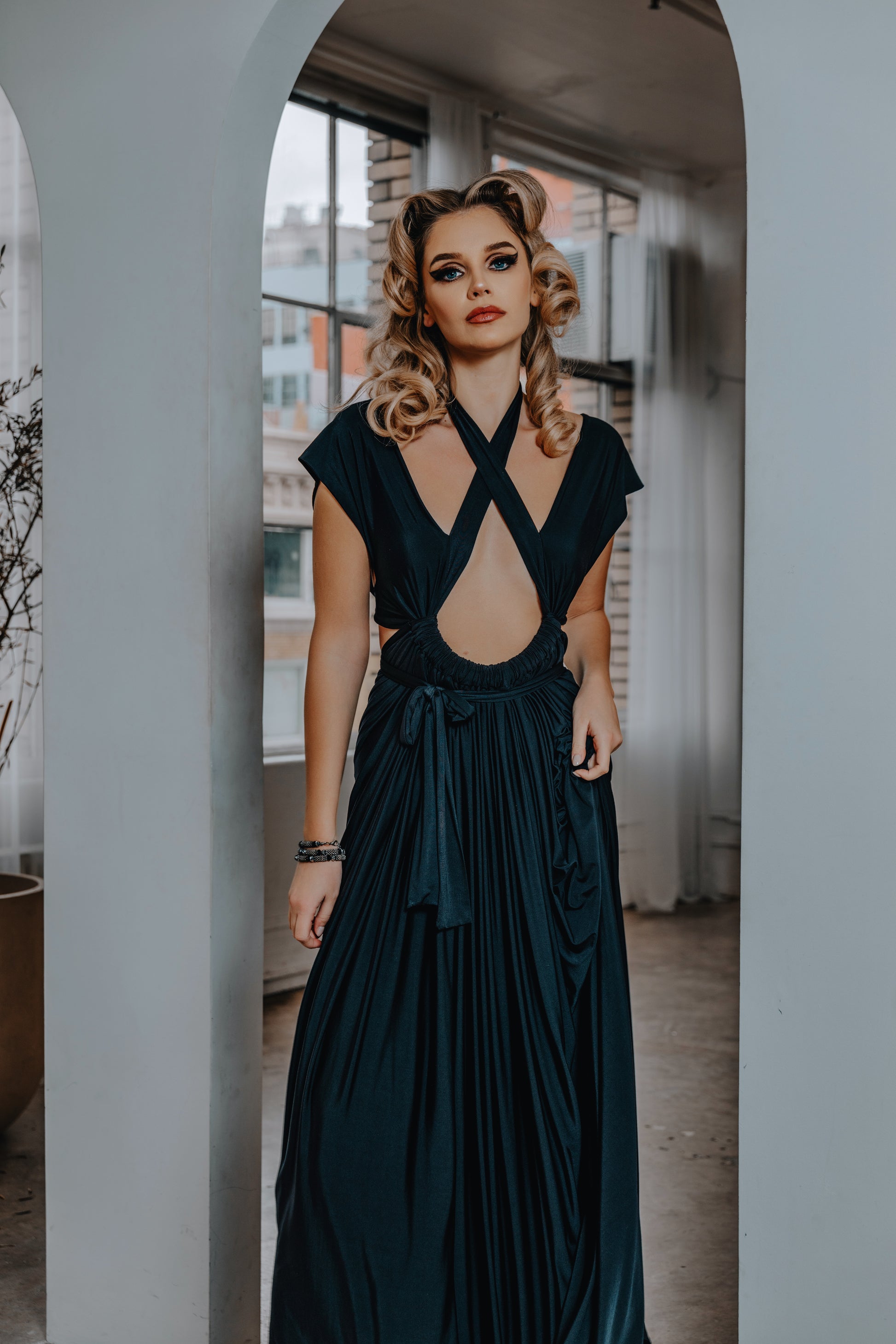 This transformable gown has straps that can act as a neckline of the gown and blend into the sleeves of the dress. Openings around the waist and lower back allow for the accentuation of these physique locations. At the waist, the gown also gathers to allow for more room and movement.